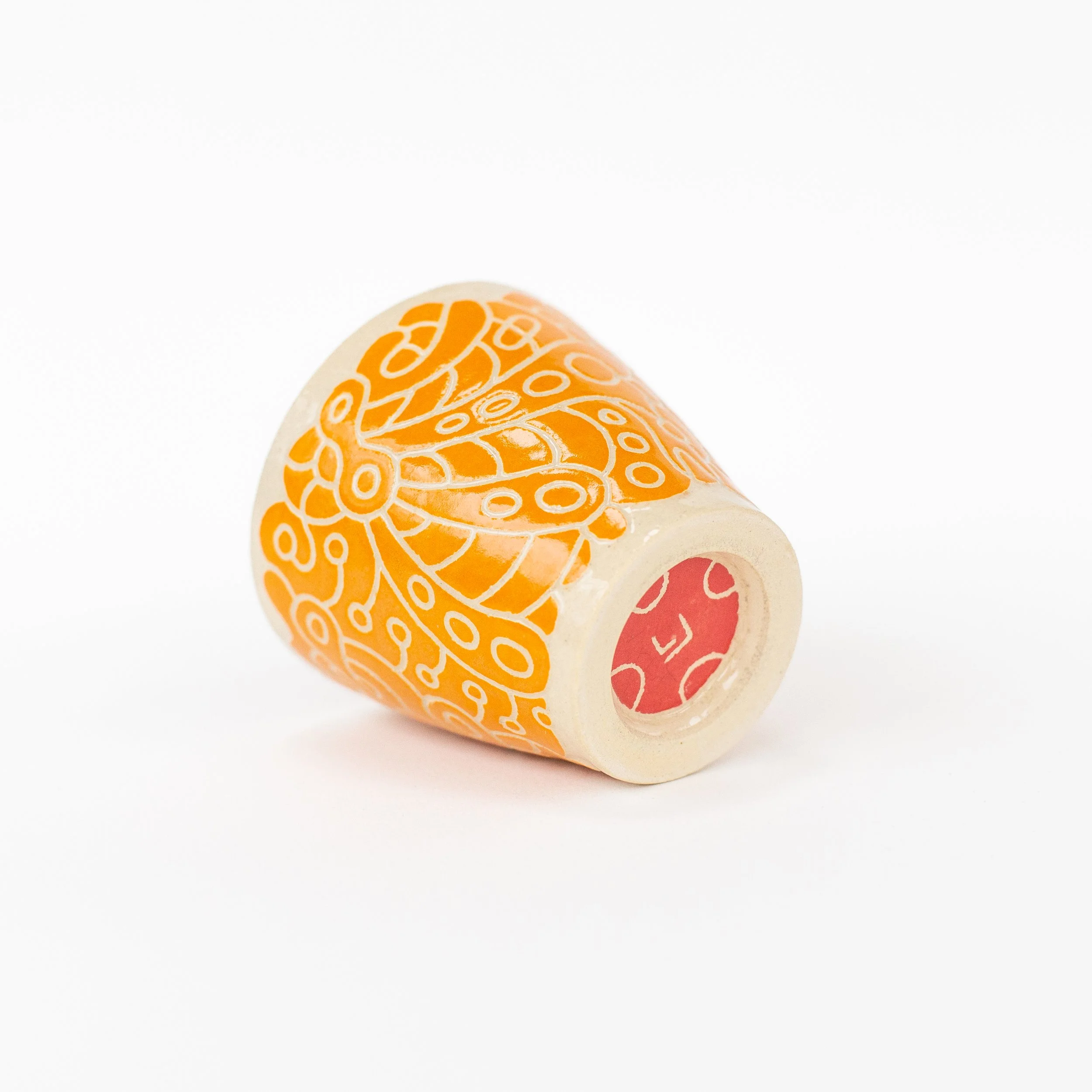 One of a kind, wheel thrown, hand painted and hand carved. Coated in clear glaze.